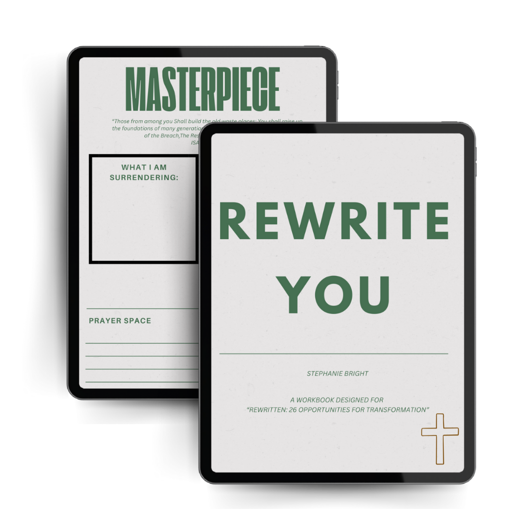 Wanting to rewrite your story this year? Maybe you're looking for a good study to do with friends or church community? Look no further! "REWRITE YOU" is a study that goes hand-in-hand with the book, "REWRITTEN: 26 Opportunities for Transformation", written by Stephanie Bright. This study will ask you the hard questions, give you space to process, and encourage you as you rewrite your story with God. Grab this for your church, for your gal group, or even for a book club!